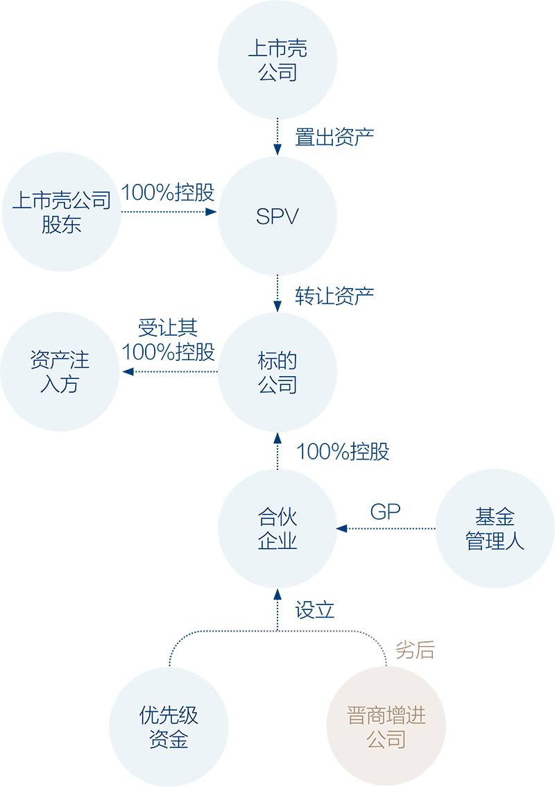 晋商信用增进公司作为劣后方,引入优先级资金设立合伙企业,进而设立标的公司,接收上市企壳公司实物资产,为上市壳公司剥离原有资产,装入优质资产奠定基础。