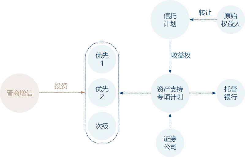资产证券化是指把流动性欠佳但有未来现金流的资产经过重组形成资源池,并以此为基础发行可在资本市场流通的证券的过程,晋商信用增进公司可投资资产证券化产品的优先级和次级份额。